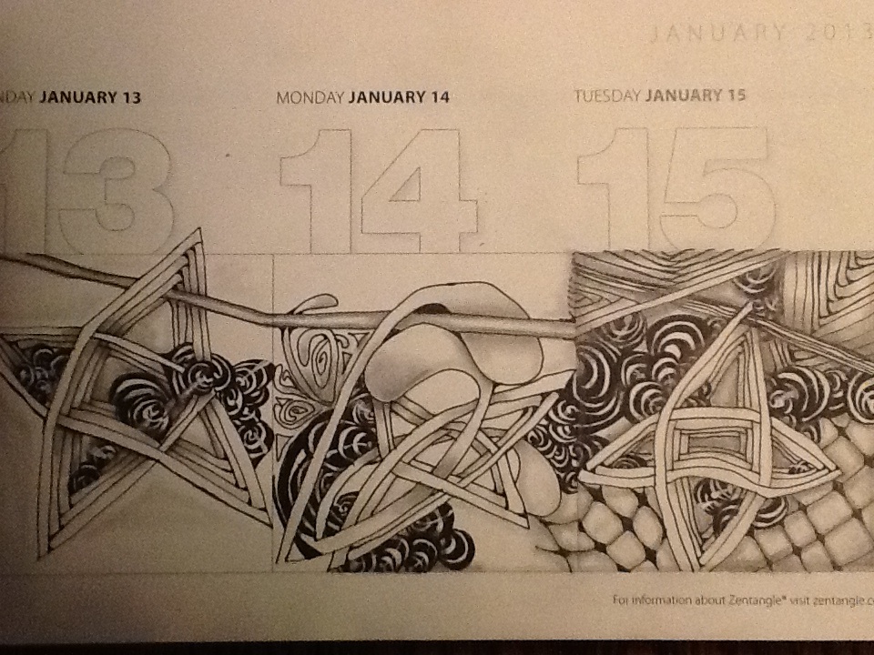 I had fun this week with Laura’s challenge aura knot and bunzo. This is a shot from my tangle a day calendar designed by Carole Ohl.