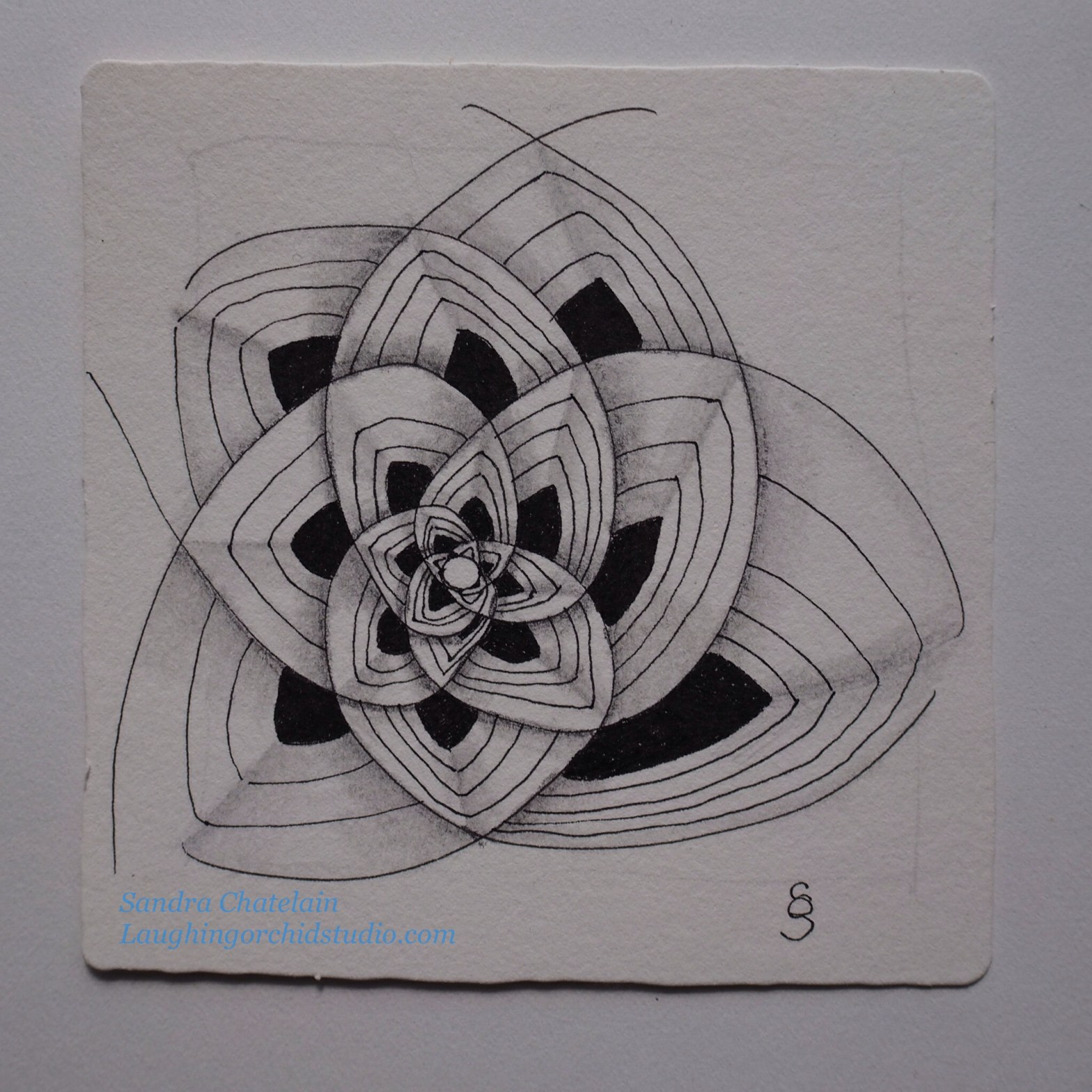 I have recently played around with this same idea as a basic string as an alternative to a grid for other grid tangles. It is basically a spiral grid. The string has lines or rays done in one direction and then the other. The trick is to keep them the same distance and curve the same amount. There can be three, four, or more rays. It really helps to rotate your tile as you build this string.